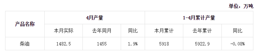 2018年4月柴油全国产量统计表