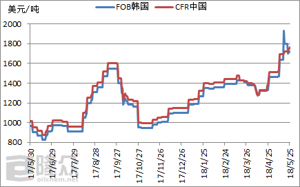 本周,亚洲丁二烯市场价格涨跌不一,尽管日本市场上仍有6月份上半月的小单需求,但多数东北亚买家已经完成6月份采购计划。市场讨论重心陆续转为7月份的抵港船货。其中有两艘来自于欧洲和巴西的船货已经抵达东北亚,多数货源已交付于韩国和中国台湾的买家。另有部分买家仍在询盘7月份抵港船货,听闻有2000吨丁二烯参考价格在1750-1800美元/吨CFR东北亚。中国丁二烯装置集中检修将在6月份结束,预期其供应紧张状态将有所缓解。CFR中国丁二烯价格收于1760美元/吨,周五小涨10美元/吨,较上周累计上涨40美元/吨,低于7月份2000吨丁二烯1800美元/吨CFR中国的成交价格。下游方面,中国南通申华18万吨/年的丁苯装置将于6月底停车检修,预计检修时间3至4周,台橡宇部7.2万吨/年顺丁装置亦将于6月底停车检修,上述橡胶装置停产将利空影响丁二烯销售。韩国市场上,听闻一生产商试图在7月份采购更多的粗C4以增产丁二烯,但另一生产商则表示将在7月份减少丁二烯供应量。听闻部分买家已采购4000-5000吨的7月份深海船货,参考价格在1700-1750美元/吨CFR韩国。消息人士称,预计7月份将有14000吨的深海船货运抵韩国。听闻有一艘装载了8000-10000吨粗C4和丁二烯的船货将在7月份运抵韩国。韩国方面丁二烯价格收于1720美元/吨FOB韩国,较上周跌80美元/吨,低于6月份2000吨丁二烯1800美元/吨FOB韩国的成交价格,也低于7月份2000吨丁二烯1700-1750美元/吨FOB韩国的价格。东南亚市场上,听闻有2000吨6月份的丁二烯意向销售价格在1900美元/吨CFR日本或者1850美元/吨CFR东北亚,但此消息并未得到证实。CFR东南亚价格收于1720美元/吨,听闻有1500-2000吨7月的丁二烯价格参考1700-1710美元/吨。